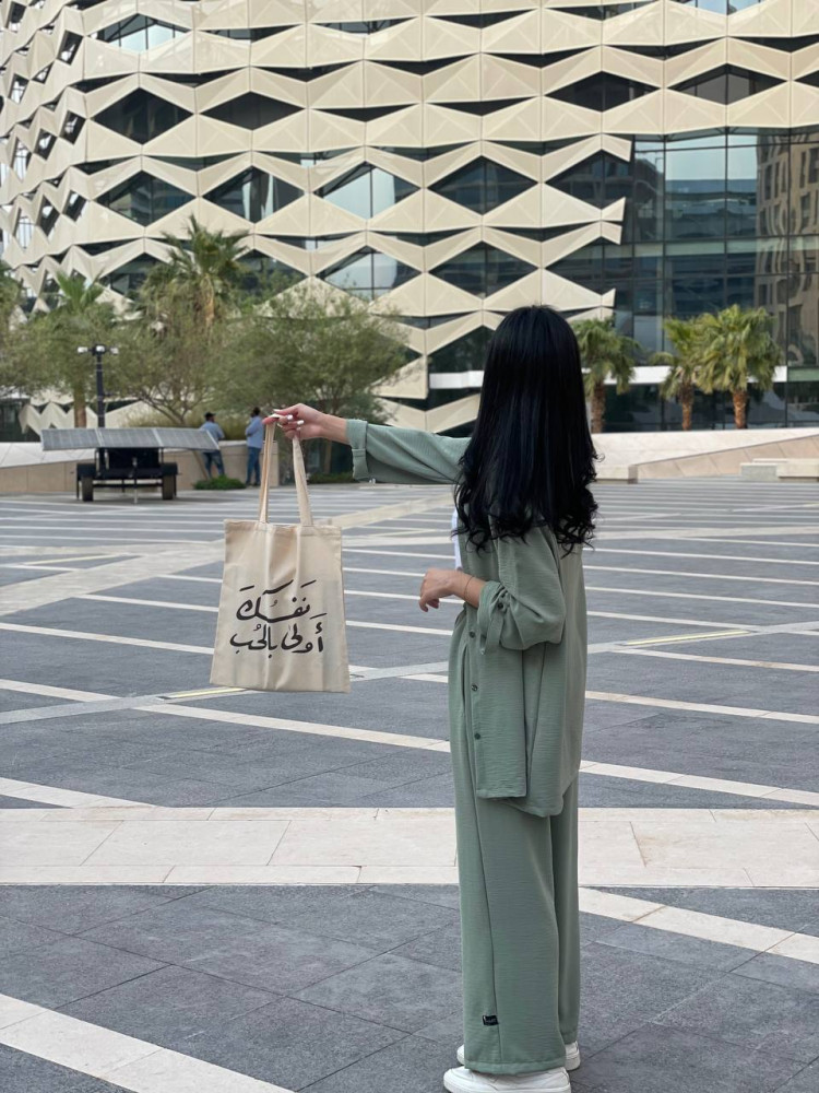 - تتميز شنطه قماشيه (توت باق) بتصميمها المطبوع الفريد الذي يحمل عبارة "نفسك أولي بالحب".